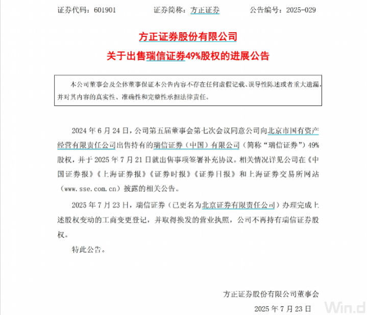 7月23日盘后,方正证券发布公告称,瑞信证券更名为北京证券,已办理完成股权变动的工商变更登记,取得换发的营业执照,公司不再持有股权。